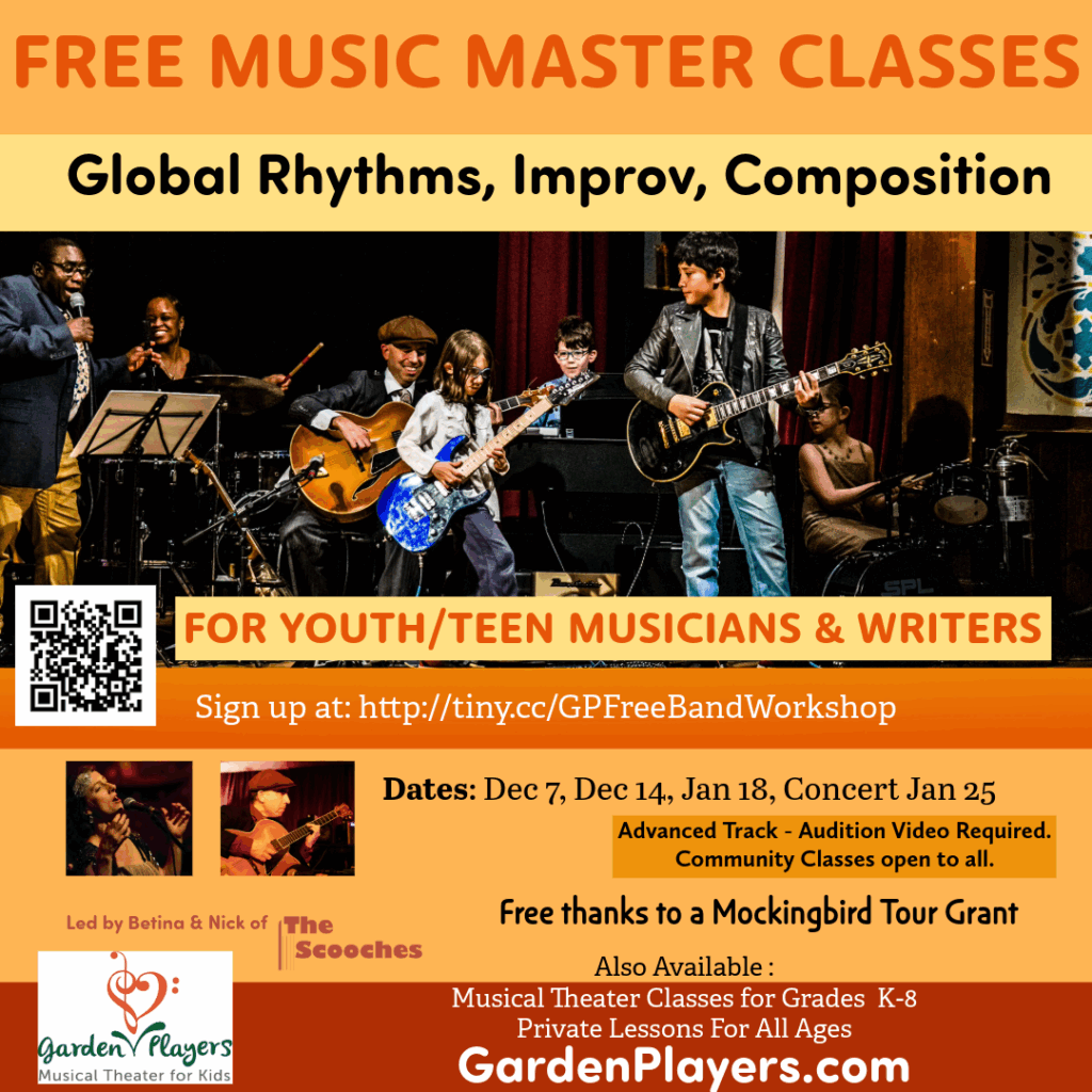 Join Garden Players’ Free Music Masterclasses — a musical journey for grades 3–12 exploring songwriting, rhythm, collaboration, and world music.